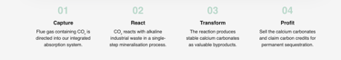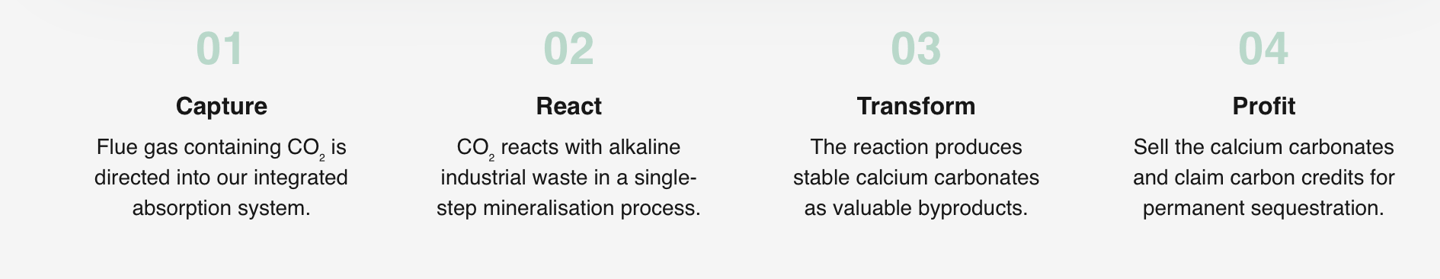 Our integrated absorption-mineralisation process combines carbon capture and waste conversion in a single, efficient step.