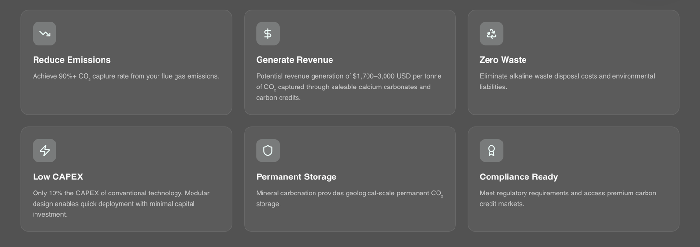 Unlike conventional carbon capture, our technology doesn't just store CO₂, it transforms your waste streams into revenue streams.